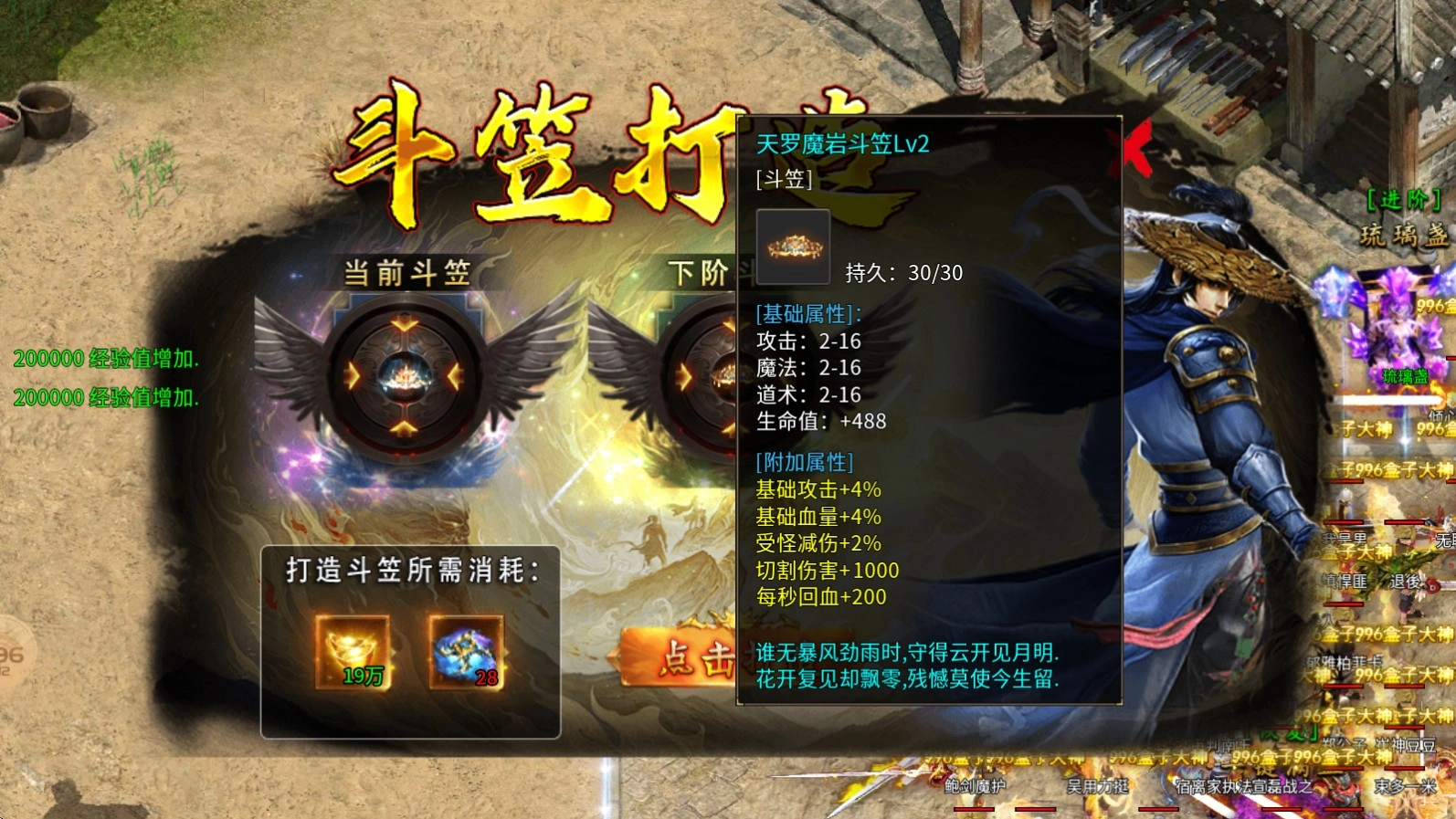 2、斗笠打造:只需消耗元宝与斗笠碎片就能进行打造,每提升一个等级,都会给予极为丰富的属性加成。斗笠碎片可通过打怪获取。