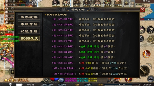 9、9星·BOSS(天仙期):具备(3满 + 50星强化)的配置,强化操作可在2大陆安全区进行